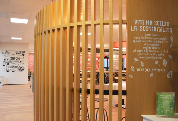 Il locale realizzato a Corte Tegge, grazie ad un investimento di 3.300.000 euro, è caratterizzato dal tipico design dei locali RITA che ricrea un ambiente informale e familiare, in cui il consumatore è posto al centro di un percorso che abbraccia un’offerta di piatti di qualità, compreso il corner pizzeria, con un servizio coinvolgente e innovativo. Con 325 coperti nell’area self-service e 50 nella sala ristorante con servizio al tavolo, accoglierà i propri clienti con menù esposti su un moderno monitor che presenterà i piatti del giorno e le iniziative in corso.