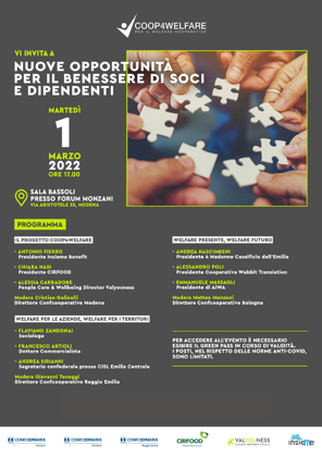 Il 1° marzo, al Forum Monzani di Modena, si è tenuta “Coop4welfare: nuove opportunità per il benessere di socie, soci e dipendenti”, importante iniziativa volta a promuovere l'accordo siglato tra Insieme Benefit (Cooperativa che opera per ottenere migliori condizioni economiche e di servizio) e Valyouness, la nuova società di CIRFOOD specializzata in servizi di welfare aziendale e territoriale, in collaborazione con Confcooperative Modena, Bologna e Reggio Emilia.